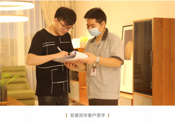 安裝并檢查完所有工作后,需與客戶清點(diǎn)并確認(rèn)產(chǎn)品,將所有帶電源的家具插上電源,告知客戶家具使用方法和功能及保養(yǎng)知識(shí)、注意事項(xiàng)等。所有帶功能的產(chǎn)品需演示給客戶看。例: