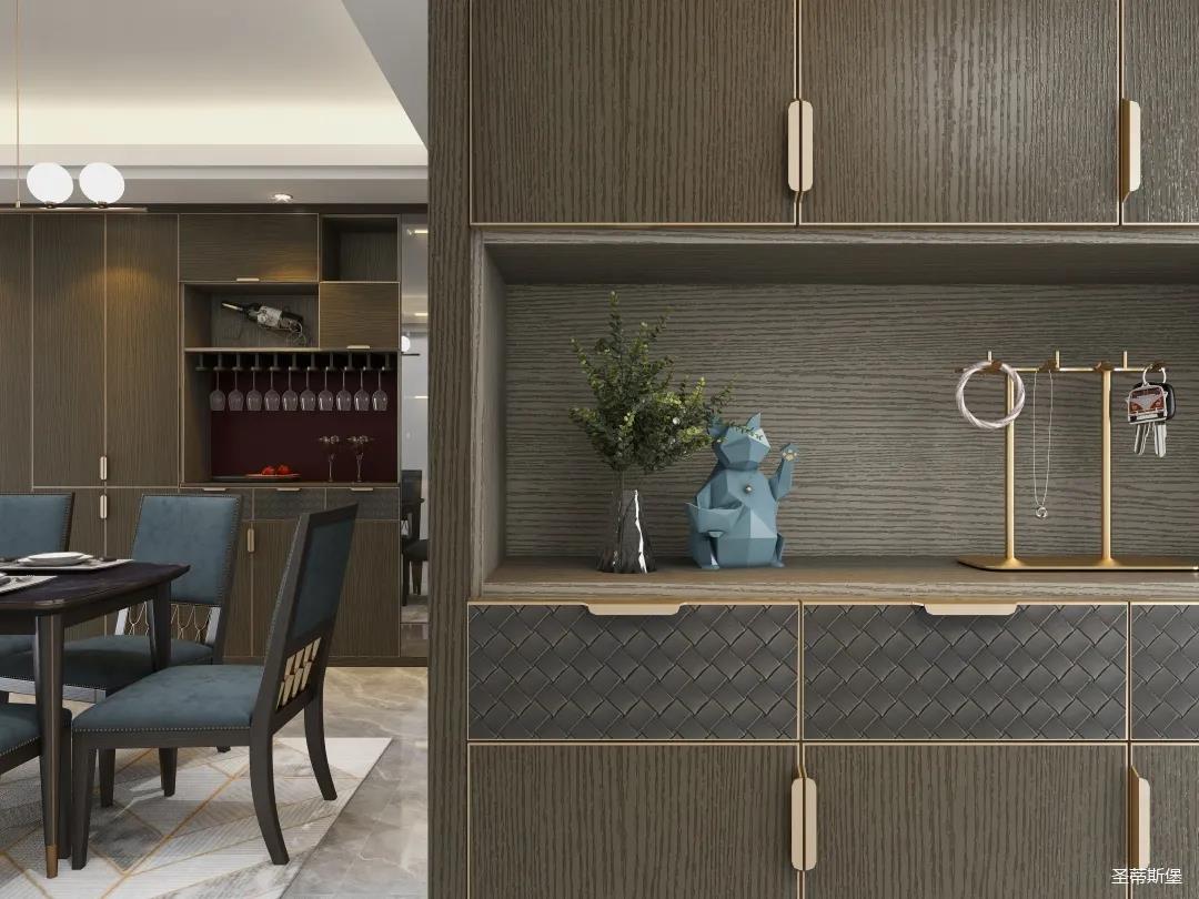 材質(zhì)的交替與光影的變換,具有濃濃的現(xiàn)代簡奢色彩。獨一無二的英倫爵士灰定制柜,由延邊鑲嵌的香檳金拉絲金屬分割,線條流暢且奢華,不僅代表著時尚,也崇尚了實木韻味。設(shè)計師將現(xiàn)代、實用、精致的藝術(shù)設(shè)計風格應(yīng)用其中,更是精致生活方式的藝術(shù)演繹。在平靜的空間中表現(xiàn)出獨特的藝術(shù)骨感,滿足我們對精致生活的精神追求。