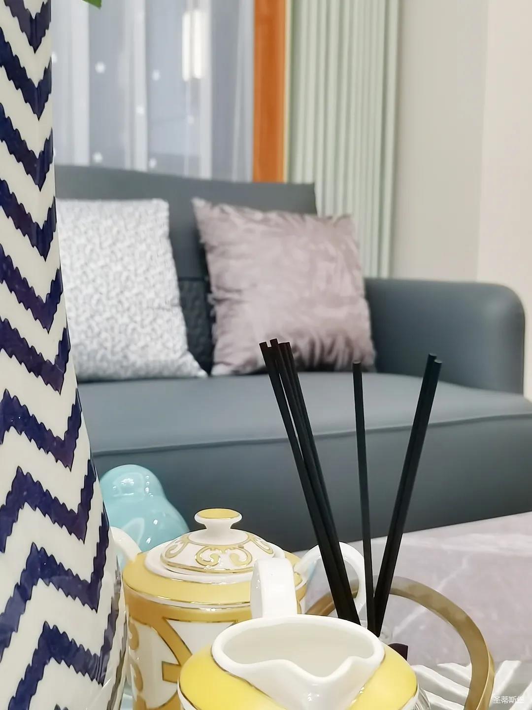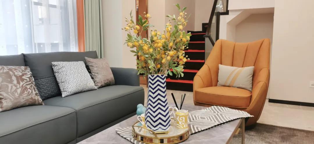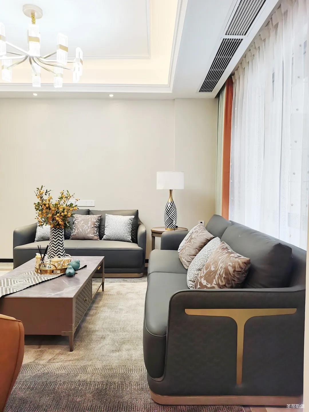 淺灰為基底的飾面與低飽和度的深色沙發(fā)相互映襯,產(chǎn)生強(qiáng)烈的視覺沖擊,深色的家具讓空間從視覺上衍生出一種縱深感。巖玻的質(zhì)感與真皮編織的紋理盡顯現(xiàn)代之美,細(xì)節(jié)陶瓷擺件注滿了空間優(yōu)雅的藝術(shù)氛圍。