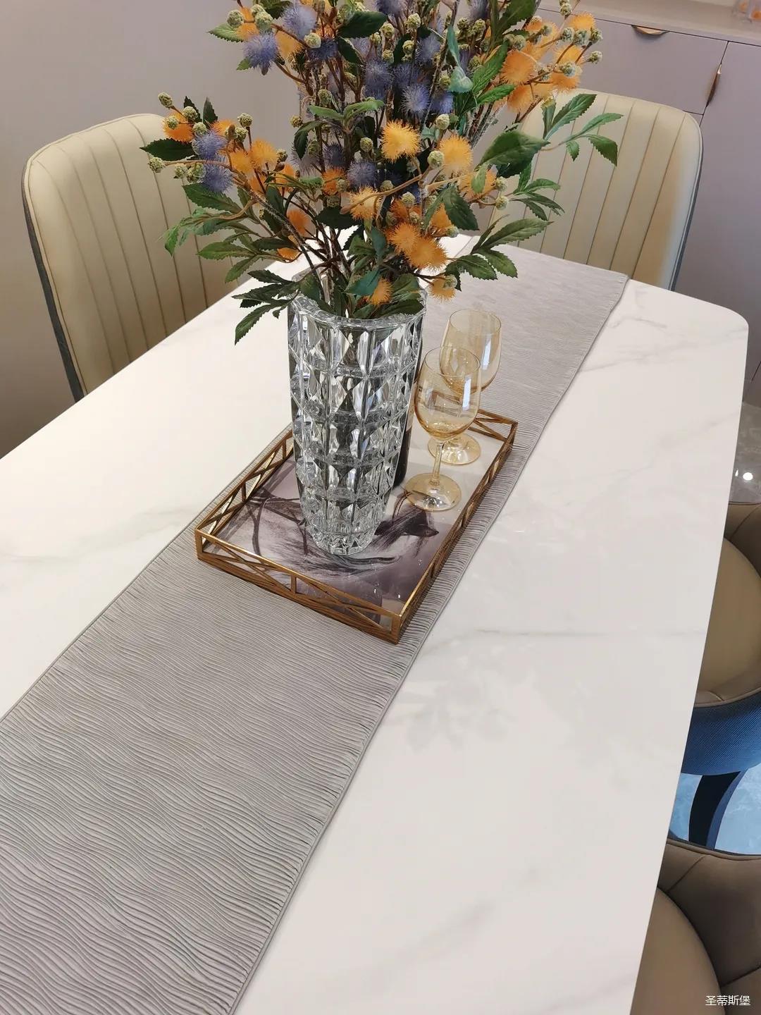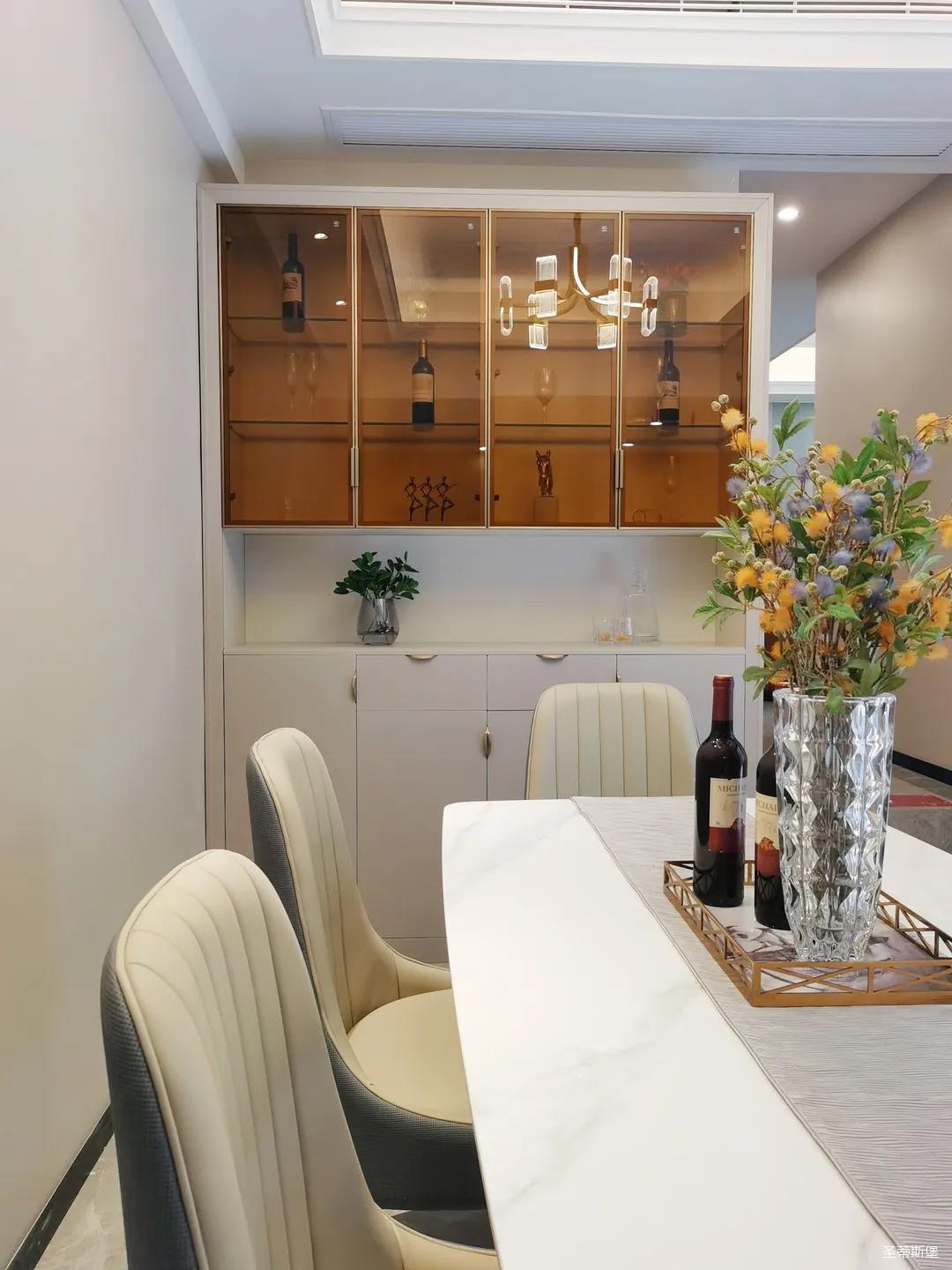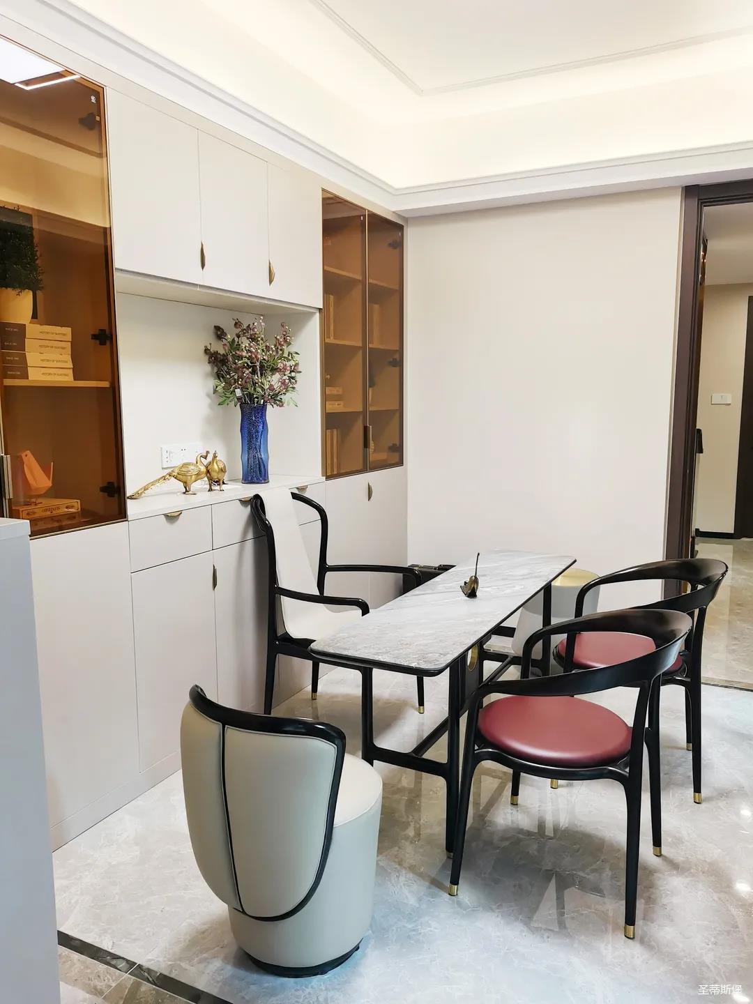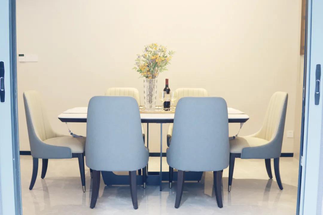 客餐廳雖屬同層,但由廊道隔開,各有寬闊的空間格局,加上引入自然光源的采光設(shè)計(jì),空間通透明亮。巖板餐桌搭配的真皮餐椅,讓不同的材質(zhì)在在空間完美契合,既增加了空間的時(shí)尚氛圍,也能給人良好的用餐體驗(yàn)。