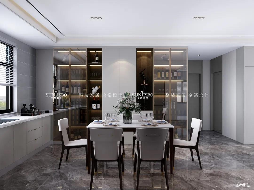 餐廳中大理石肌理的桌面自然袒露,自然親膚的觸感、皮革質(zhì)感的現(xiàn)代餐椅坐感舒適自然。沉穩(wěn)的實木材質(zhì)延伸,精致的瓷白餐盤搭配金屬質(zhì)感的物件,通透的玻璃器皿點綴其中,契合了業(yè)主對品質(zhì)生活的追求。